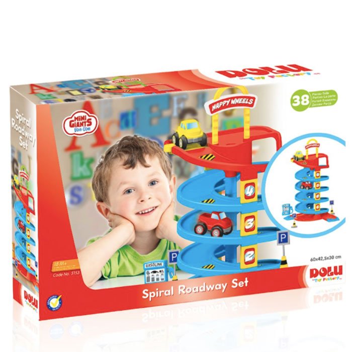 Ovaj garažni set sadrži automobilsku stazu na četiri nivoa, dva automobila, bezinsku pumpu, saobraćajne znake.