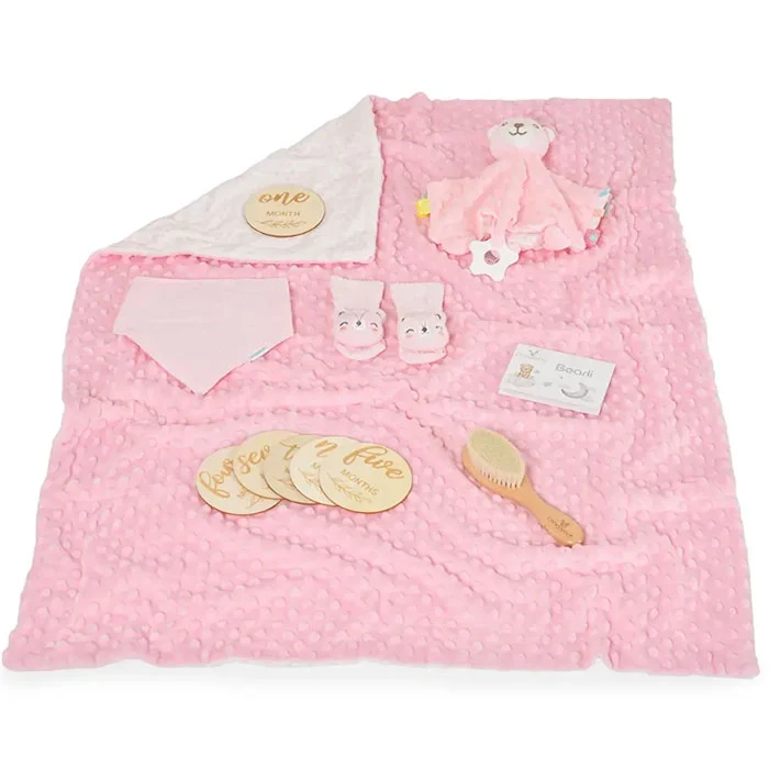 Cangaroo Poklon set za bebe 6u1 Bearli Pink sadrži oplo ćebe,omiljenog medu tešilicu, slatke čarape,prirodnu četkicu za kosu i nekoliko sitnica.