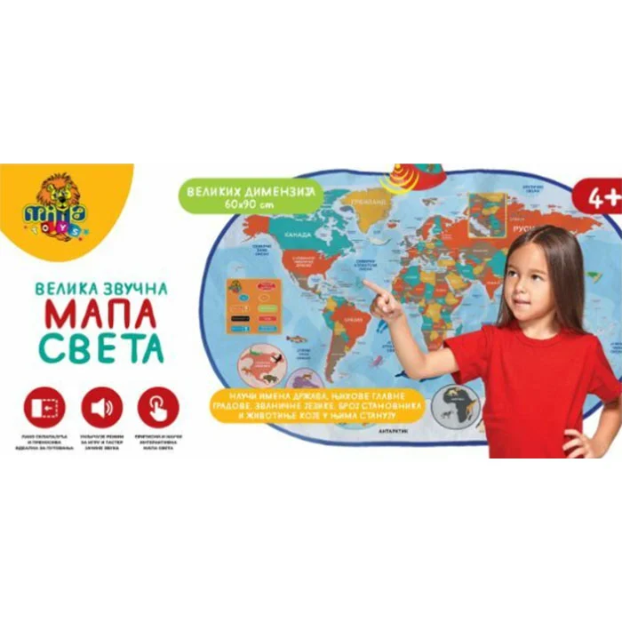 - Velika zvučna mapa sveta je interaktivna i edukativna igračka koja omogućava deci da istražuju geografiju sveta kroz zvuke